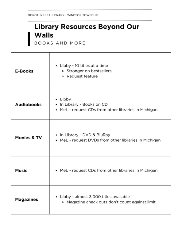 Along with access to all our physical books, magazines, movies, and audiobooks, your library card provides you with free access to a number of resources for finding even more materials!